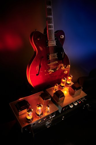 Produktová fotografie zakázkového kytarového zesilovače. Požadavkem zákazníka byly dvě sady fotografií. První sada měla obsahovat studiové technicky popisné fotografie na bílém pozadí, druhá sada pak kreativní fotografie, zcela na mém uvážení, s důrazem na "rozžhavené" lampy. Obě verze jsem fotografoval v mém ateliélu